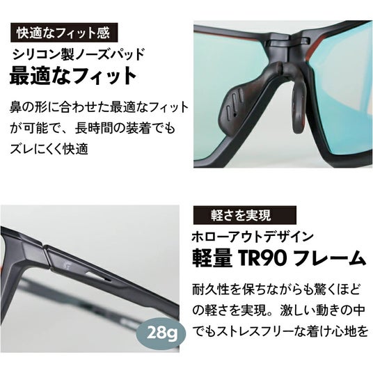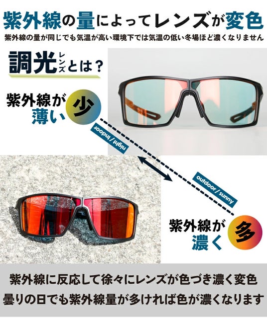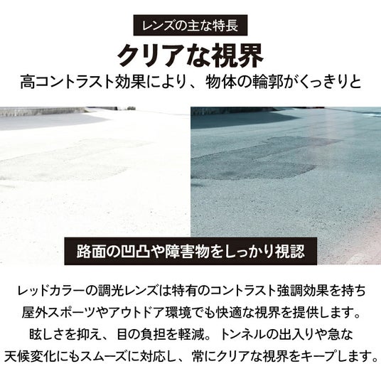 レンズタイプ: PC調光レンズ(レッド変色)/レンズ構造: 2枚独立型レンズ /可視光透過率 (VLT) 変化範囲:/明るい環境: 8-18%(濃いレッドに変化)/暗い環境: 80%(クリアに近い状態)