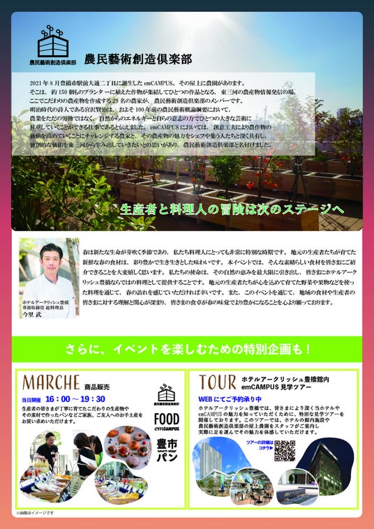 2021年8月に誕生したem CAMPUSの屋上農園でこだわりの農産物を育てる「農民藝術創造倶楽部」の皆さまと総料理長 今里武との一日限りのスペシャルコラボレーションブッフェ「SPECIAL FAEMERS COLLECTION」。