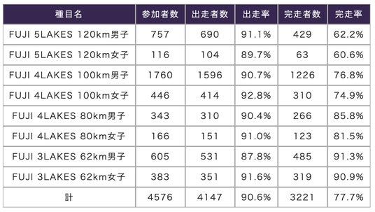 FUJI 5LAKES(120km)では男女ともに大会新記録が誕生。FUJI 4LAKES(80km)は新設種目として記念すべき初代チャンピオンが誕生しました。