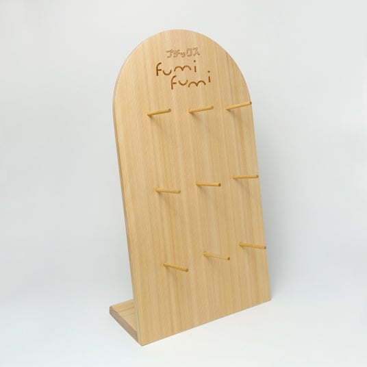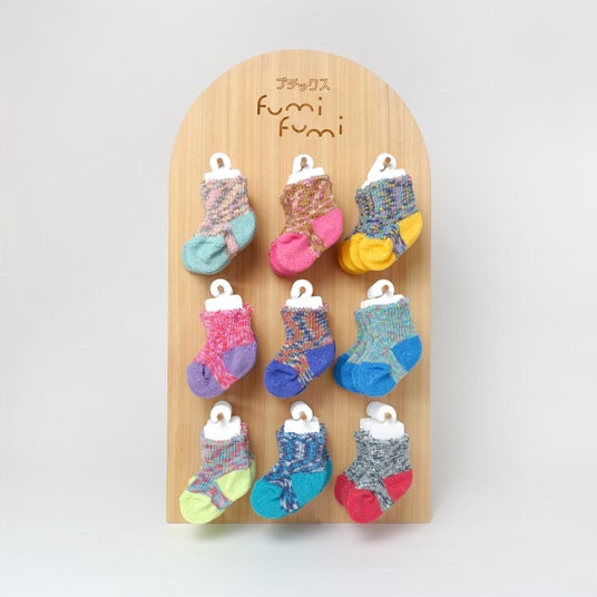 「プチックスfumifumi」専用スタンド(卸専用)は、商品を並べるとまるで靴下売り場のミニチュアのように見えるデザインにしています。製作は、奈良県川上村で木工食器の製造・販売を行う「工房アップルジャック/株式会社FROM0(フロモ)」(奈良県吉野郡川上村、代表 小林美緒)に依頼しました。耐久性に優れ、節がほとんどなく、真っすぐで均等な木目が美しい吉野檜(ヒノキ)を使用。その艶やかさとあたたかみが、カラフルな「プチックスfumifumi」の魅力を引き立てる、オリジナルスタンドが完成しました。創喜は、奈良のものづくり企業と共創しながら、新たな価値を生み出していきます。