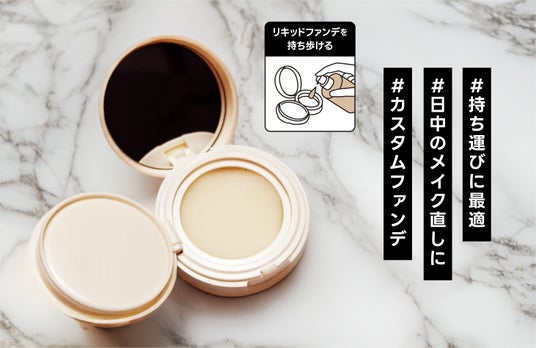 リキッド・クッションファンデーションのどちらにも対応。2ステップでお手持ちのファンデを簡単に詰め替えられるので、外出先でも気軽にメイク直しが可能です。合コンやデート、外出中のちょっとしたお直しも、ポケットに忍ばせておけば安心です。