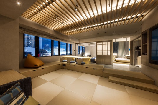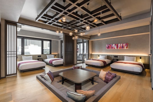 北側の客室には掘りごたつ風のリビングダイニングを設け、大人数でもくつろげる和モダンな空間を演出。一方、南側の客室は通天閣をはじめとする大阪の夜景を一望できる開放的な空間で、非日常のひとときを提供いたします。