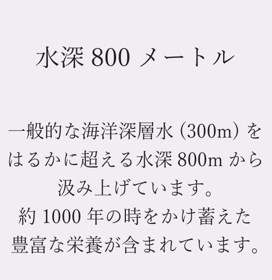 ■血液のミネラルバランスに近い、からだに寄り添うミネラル水「あなたのからだに近い水」は、伊豆の深海から生まれた海洋深層水。ミネラル成分が豊富で、口にすっと染み込むような、なめらかな軟水です。 原水は、水深800mから汲み上げており、長い年月をかけて育まれた清らかな水は、現代人の健やかな暮らしを支え、毎日の水分補給に確かな安心をお届けいたします。