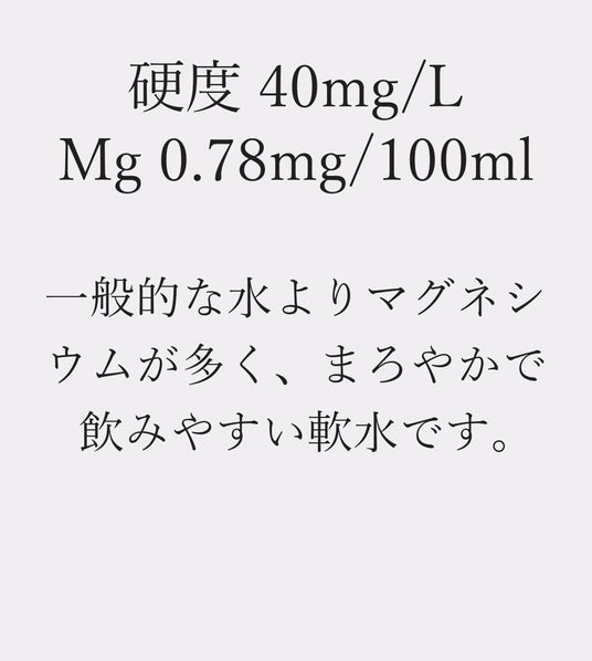 優れたミネラルバランスを備えたこの水は、細胞の活性化を助け、内側から美容と健康をサポートいたします。ナトリウムをはじめとする豊富なミネラルが、スポーツやサウナなど汗をかいた後の失われたミネラル補給にぴったり。また、まろやかで飲みやすく口当たりが良い軟水であるため、コーヒーや紅茶を淹れると、香りや味が引き立ちます。お料理の出汁や炊飯、日々の水分補給など、あらゆるシーンに適しています。
