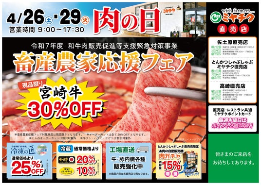 株式会社ミヤチク(本社:宮崎県都城市/代表取締役社長:船ヶ山 祐二)が運営する「宮崎牛」「宮崎ブランドポーク」「ハム・ソーセージ」を取り扱う直売店(宮崎県内3店舗)にて、お肉を割引価格でお買い求めいただける「肉の日」を「4/26(土)・29(火)の2日間」開催します!感謝の気持ちを添えた母の日ギフトやGW(ゴールデンウィーク)中のBBQ利用にぜひいかがですか?