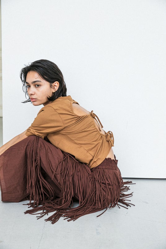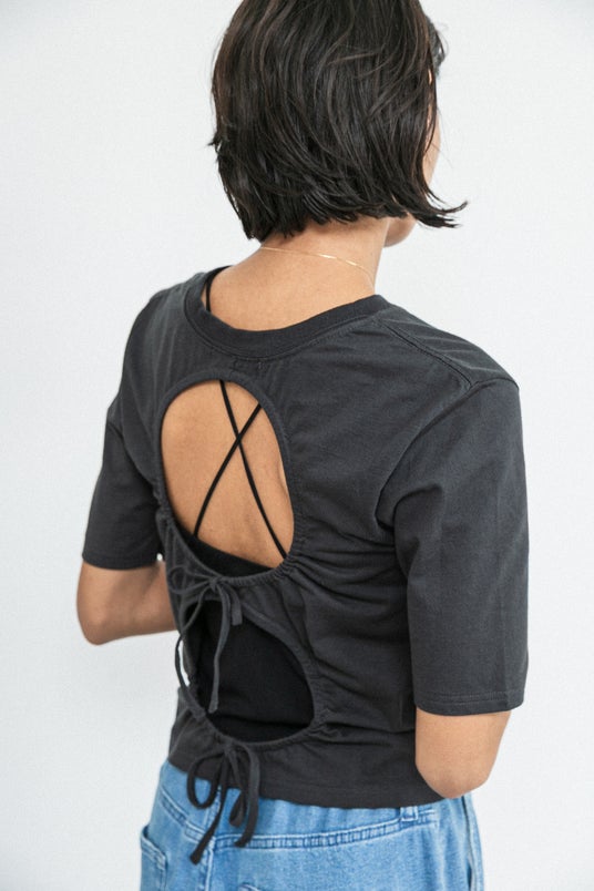 デザインのアクセントになる背中の大胆な2つのホールは、紐を絞らずフラットに着るのはもちろん、