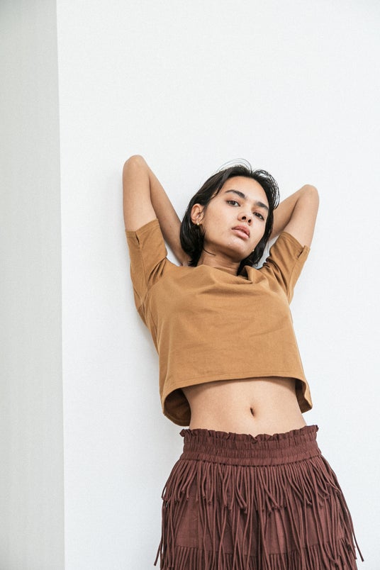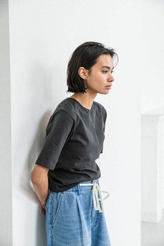 カットソーのカシミアとも言われるインド長調綿で作られた生地は、美しい表面感とサラリとした肌触りで着心地がよく、コンパクトなサイズ感とスリットのある5分袖でスッキリとしたシルエットに仕上げました。