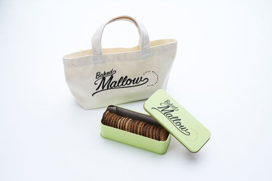 ベイクドマロウの看板商品「焼マシュマロサンド」に使用のグラハムチョコクッキーだけを詰め込んだ限定缶!新登場のオリジナルトートバッグとセットで販売。バッグはナチュラル、スカイブルーの2色からお選びいただけます。※単品での販売はございません。