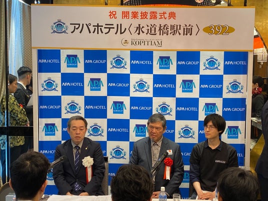 アパグループ社長兼最高経営責任者(CEO)の元谷一志は、記者発表において「本日、水道橋駅徒歩1分の好立地に千代田区内15棟目となるホテルを開業できたことを大変嬉しく思う。水道橋駅周辺は東京ドームや多くの大学が集まるエリアであり、それに加えて令和2年度の国勢調査によれば、千代田区の昼間人口は夜間人口の13倍以上に達するというデータもあり、それだけ多くの人が行き交う、宿泊ニーズの高いエリアだと分析している。当ホテルでは、新たなイノベーションとして、非常用放送設備と客室テレビを連動させて、火災発生時にその情報をテレビ画面へ4ヶ国語でリアルタイムに表示するシステムを新たに開発・導入した。このように火災などの有事に備えた設備投資も行い、お客様の安全・安心・安眠を守っていく。一昨日の4月19日(土)には、イースター休暇に伴う訪日外国人の宿泊需要も重なり、アパホテル全体として単日過去最高売上を記録した。また、本日現在のアパホテルネットワークは、932ホテル・132,279室と目標の15万室に向けて着実に拡大を進めている。今後も地域に根差しながら、更なる拡大を目指していく。」と述べた。