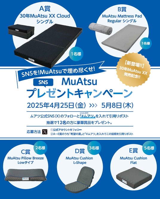 “眠りの質”を追求し続ける昭和西川株式会社(所在地:東京都中央区、代表:西川惠)では点で支える独自の凹凸構造で長年愛されてきた寝具「MuAtsu(ムアツ)」シリーズを2025年3月にリニューアル。ハイスペックモデルの「20年MuAtsu」からさらに進化した「30年MuAtsu」を新たに発表いたしました。これを記念して、公式SNS(X)にて、抽選で12名様に豪華賞品が当たる「#ムアツSNSキャンペーン」を2025年4月25日(金)~5月8日(木)の期間限定で開催いたします。