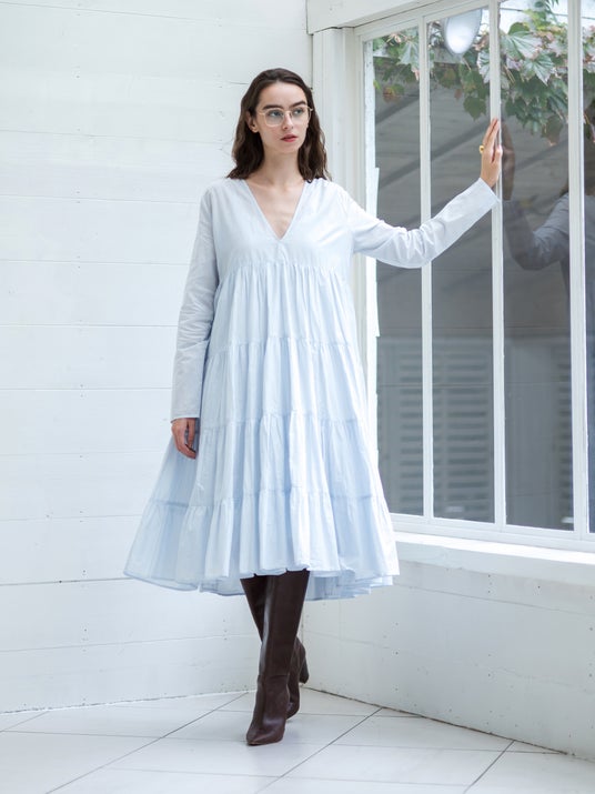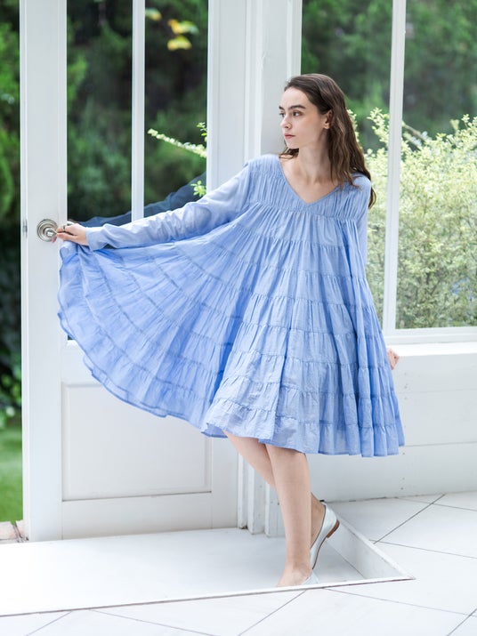 即完アイテムとして伝説になったBAHAMA MAMA Dressを透明感のある優しいブルーで復刻しました。アメリカ・カリフォルニアのモンテシートにオープンしたマーレットのポップアップストアと日本だけの限定。長袖、ボリュームたっぷりのティアード、すっきりした膝下丈が人気で、デイリーユースもしやすいドレスは、一枚でも重ね着でも着回せるシーズンレスで重宝するアイテムです。