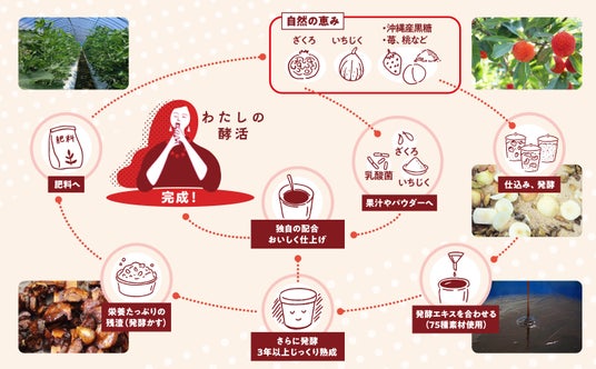 「わたしの酵活」は、日々を忙しく過ごす女性たちが、自分の心とからだをいたわるきっかけを持てるように、という思いから生まれた発酵インナーケアブランドです。福岡県産イチジク「博多とよみつひめ」などの青果として市場に流通しない規格外の農産物を活用し、素材の力を余すことなく引き出しています。また、製造過程で生じる発酵残さも肥料として再利用し、自然に支えられ、自然に還すものづくりに取り組んでいます。