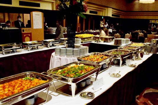 シェフによるカッティングサービスでは、じっくりと焼き上げたローストポーク、ケイジャングリルチキン、骨付き子羊モモ肉のハーブ焼き、中華料理を代表する名菜 北京ダック、またゲストの目の前で仕上げるシェフサービスでは3種のソースからお好みで楽しむ、パルメザンチーズケースで仕上げるパスタステーションをご用意いたします。