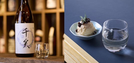 左) ●千瓢「千実」純米吟醸 (90ml) 1,100円 右) ●千瓢「千実」純米吟醸(90ml)&みりんレーズンアイス 1,650円