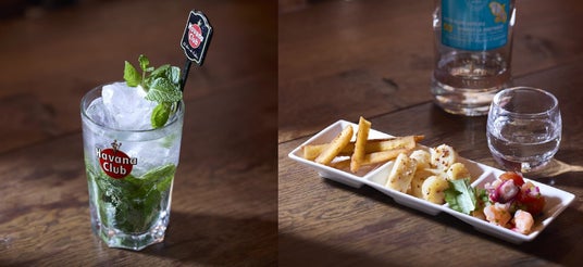 左) ●モヒート(キューバのカクテル)(1杯) 1,650円 右) ●トロワ・リヴィエール・ブラン(ホワイトラム)(1杯)&クレオール料理前菜盛 2,750円