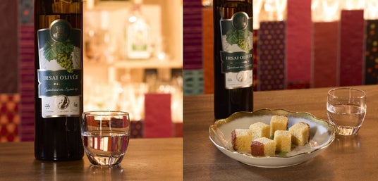 左) ●シチェック イルシャイオリヴェール(白ブドウ)パーリンカ (15ml) 1,100円 右) ●神楽坂 五十鈴のカステラwith オリーブオイル 550円 ※数量限定
