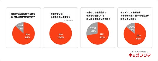 また、「お金の学びは必要だと思いますか?」に100%が「はい」と回答、87%が「普段から子どもとお金に関する話をしている」と回答する一方で、72%が「お金のことを家庭内で教えるのを難しいと感じたことがある」と回答しました。