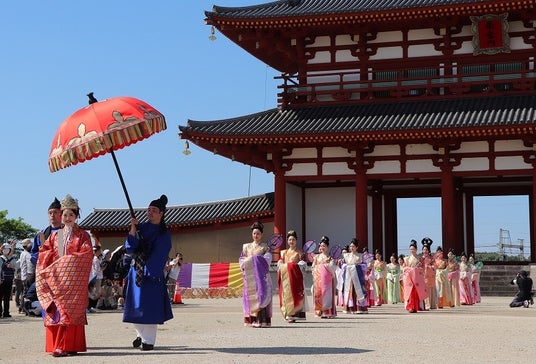 平城宮跡歴史公園では、2025年5月3日(土・祝)、聖武天皇・光明皇后と貴族たちの華やかな「天平行列」をはじめ、衛士隊の行進や朱雀門開閉の儀式、天平衣装体験、奈良時代の市の再現などを実施します。このイベントは、「平城京天平行列実行委員会」とともに、奈良時代を今に伝えながら、奈良のにぎわい創出を目指しています。