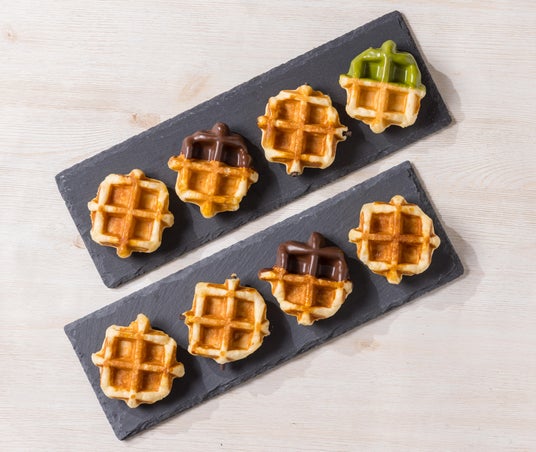 生地に北海道産発酵バターを練り込んだ丸い形のリエージュワッフル。レギュラー商品の「発酵バター」「バトンショコラ」の他、ミニサイズでしか味わえない「チョコレート」「季節のチョコレート(抹茶)」の合計4種類をご用意。