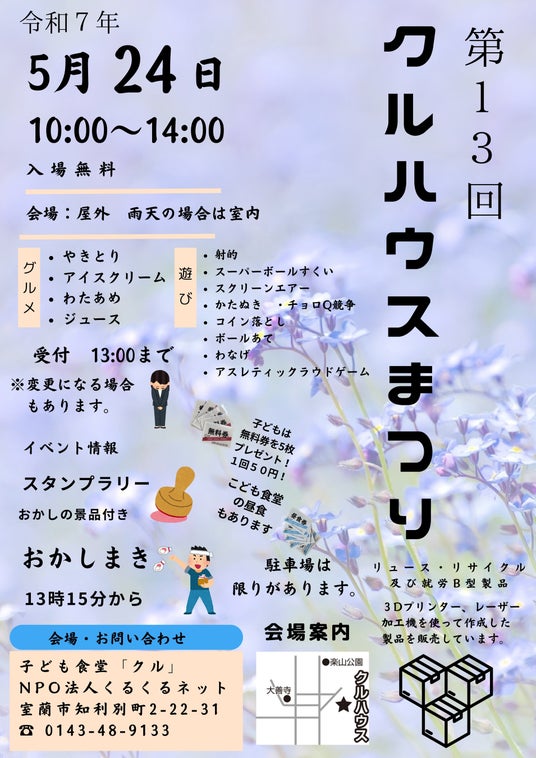 このたび、特定非営利活動法人くるくるネットでは、地域交流と子どもたちの健やかな育ちを目的に、第13回「クルハウスまつり」を下記の通り開催いたします。つきましては、地域の皆様に本イベントの情報を広く届けるため、貴媒体にてご紹介いただけますようお願い申し上げます。