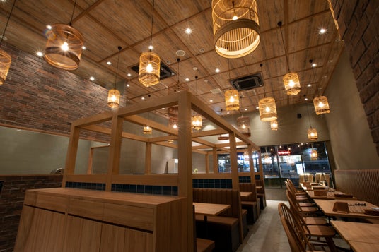 また、席は広めのテーブルとボックス席を中心に配置。周囲の目線をほどよく遮る格子デザインを取り入れており、小さなお子さま連れのご家族や、ゆったり食事を楽しみたいカップルにも最適な空間です。