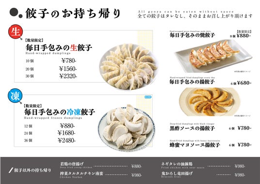 店内での飲食だけでなく数量限定の生餃子のお持ち帰りも可能。