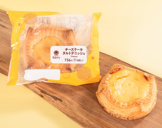 【内容】チーズケーキタルトとデニッシュを組み合わせたハイブリッド商品です。歯切れの良いデニッシュ生地に、クリームチーズを使用したチーズケーキ生地を組み合わせ、さらにデニッシュ生地の下にザクっとしたタルト生地を組み合わせました。