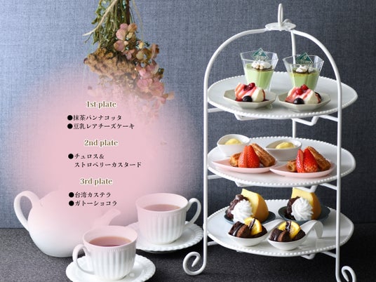 しっとりと優しい甘さの「台湾カステラ」や、春を感じる「抹茶パンナコッタ」、ほんのりビターな濃厚な味わいの「ガトーショコラ」など、和と洋のラインナップをちりばめた、フォトジェニックな3段重ねの『スイーツスタンド』は、まるでスイーツの宝石箱!