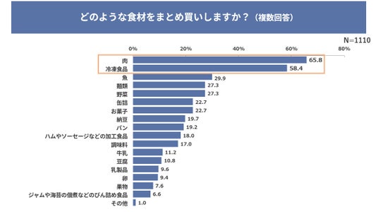 まとめ買いすることが多い食材は「肉類」 65.8%、「冷凍食品」58.4%》