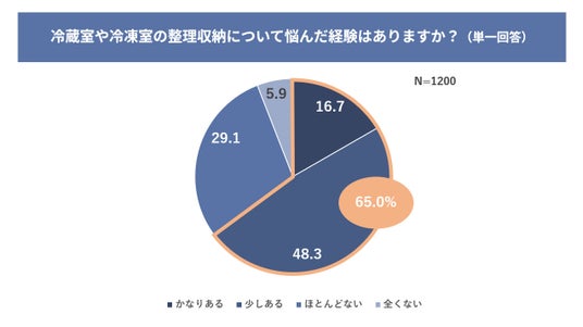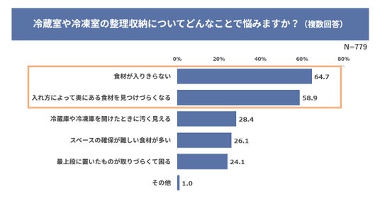 悩みで多いのは「食材が入りきらない」64.7%、「入れ方によって奥にある食材を見つけづらくなる」58.9%》