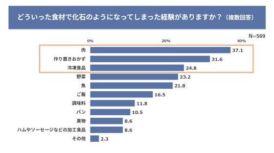 化石のようになってしまった経験のある食材は「肉類」37.1%、「作り置きおかず」31.6%、「冷凍食品」24.8%。