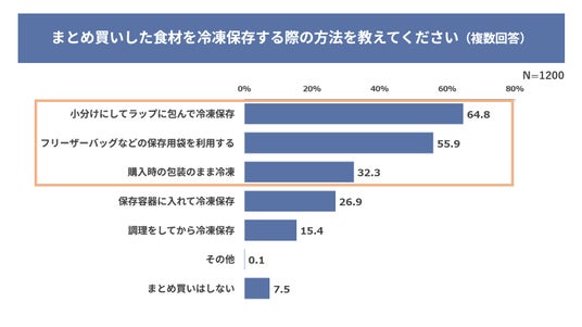 ・まとめ買いをしたときの保存法トップ3は、「小分けにしてラップに包んで冷凍保存」、「フリーザーバッグなどの保存用袋を利用する」、「購入時の包装のまま冷凍」。