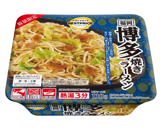 「福岡博多焼きラーメン」は、豚肉と豚骨のエキスをベースに、ニンニクや醬油などで味を調えたコクと旨みのある液体ソースに、博多豚骨ラーメンをイメージした細麺を絡め、まるで福岡博多の屋台で食べるような豚骨スープで炒めた焼きラーメンの味と香りを再現しました。