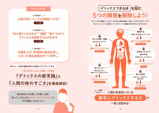 「身近なスパイスの組み合わせでつくれる『デトックスカプセル』や、たまった毒がスッキリ流れる『5大リンパストレッチ』など、実践しやすく高い効果のメソッドを厳選紹介!