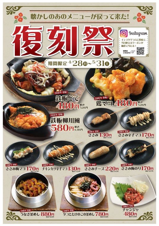 株式会社あみやき亭が運営する「元祖やきとり家 美濃路」では、かつての人気メニューを復活させた**「復刻祭」**を、2025年4月28日(月)~5月31日(土)までの期間限定で開催いたします。