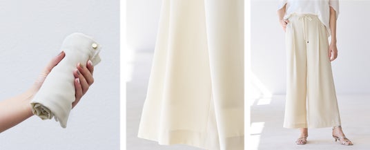 今シーズンは、リラクシーな着心地で上品な見え感、そして大人女性に嬉しい機能がそろったノンストレス服「サラサラリラクシーシリーズ」が登場。サラッとした肌触りでシワになりにくく、機能も満載。UVカット/接触冷感/シワ軽減/イージーケアの4つの機能性が、これからのシーズンのお出かけや旅行にも最適です。くるくると小さく畳んでもシワになりにくいので、持ち運ぶ場面や乗り物での移動時間が長い旅行シーンでもノンストレス。また、究極にリラクシーな履き心地なのにキレイな表面感なので、お仕事やお出かけでもきちんと見えが叶う、大人女性に寄り添う究極のアパレルシリーズとなっています。