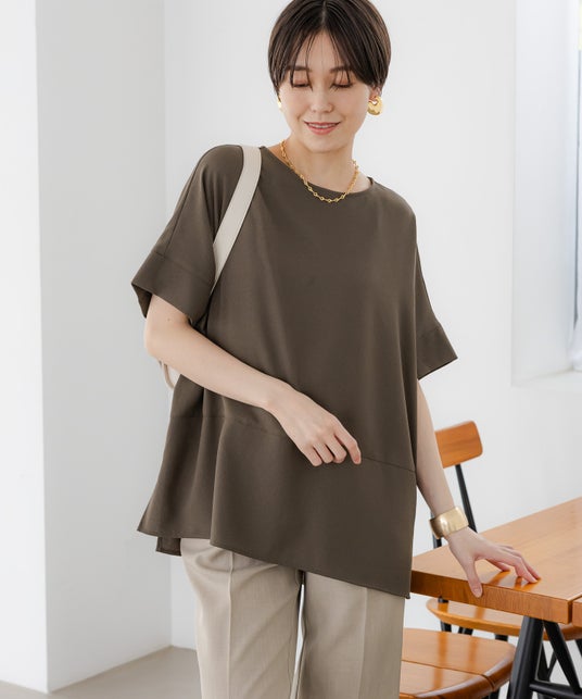 Tシャツ感覚で着られるのに、上品な見え感も叶うTブラウス。ゆとりのあるシルエットで、おしりまで隠れる長めの丈感が嬉しいデザインです。袖と裾の切り替えが、1枚でもシンプルになりすぎず、スッキリ見せながら体型カバーも叶う万能トップスです。