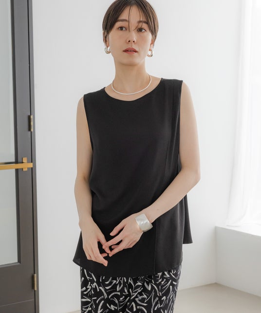 すっきり見えるフラットデザインとカシュクールデザインの前後2WAY仕様で着回し力抜群なノースリーブブラウス。