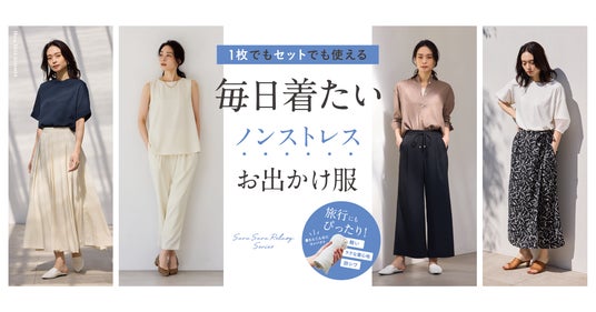 ノンストレスで着られるサラサラリラクシーシリーズ全9アイテムが登場。シワ軽減・イージーケア・UVカット・接触冷感を兼ね備えた旅にもおすすめの究極のキレイ見え服