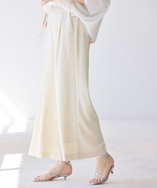 ウエストの華奢なリボンとゴールド金具でイージーパンツでもきれい見えが叶う大人のワイドパンツ。落ち感のある素材で作られたワイドシルエットは下半身をスッキリ見せ、スタイルアップも叶います。