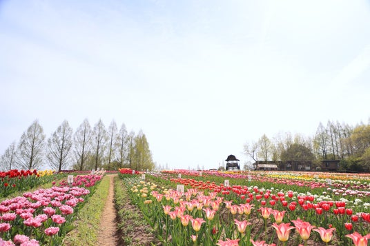 毎年人気の「虹の畑」では、大きく弧を描いて咲く色とりどりのチューリップが咲いています。みはらしの丘展望台からは、約20万本のチューリップを使って描かれた風景を一望できます。