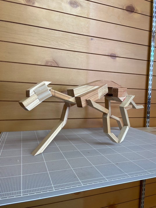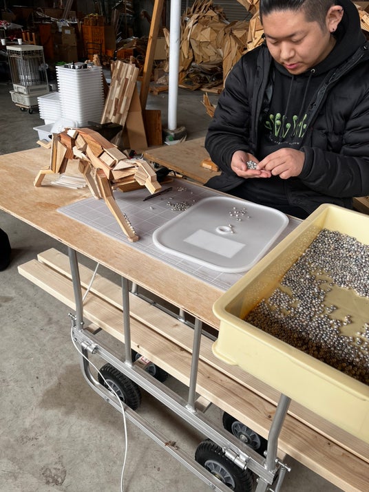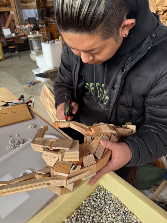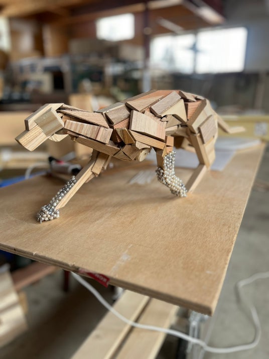 工務店や飲食店などから譲り受けた、木の廃材にこもる人の軌跡を受け継ぎ、血が巡り、筋肉が収縮し、毛がなびく動物へと生まれ変わらせている。大工だった祖父より受け継いだ技術と緻密に計算された骨格比率により、優れた強度と造形美を実現。代表作の一つである「神籬」は人が乗れるアートとしてSNSでも話題になる。