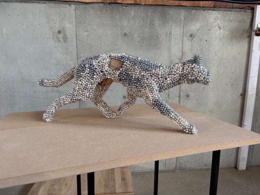 加治氏の作品の特徴である、動物のしなやかな筋肉や躍動感。細分化された木の廃材から猫の形態へ、そしてネイチャーパールをまとい、希少なアート作品が完成しました。今にも歩き出しそうな風貌の猫のモチーフには、約4000個のネイチャーパールが使用されています。