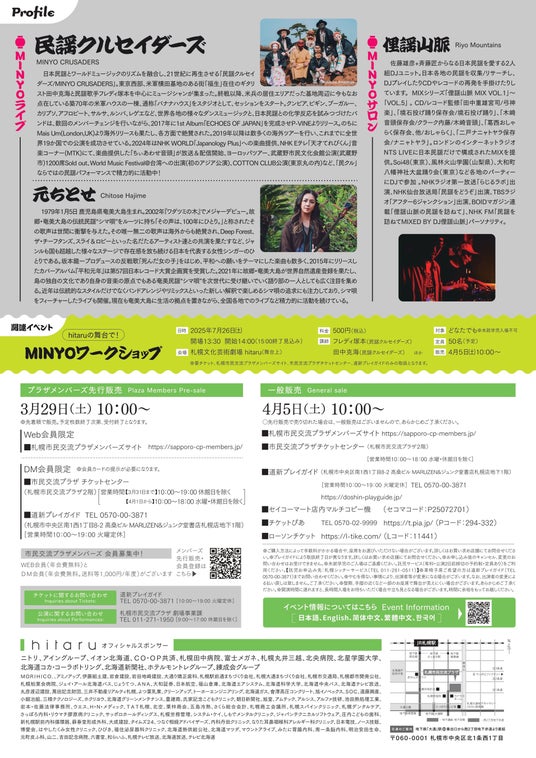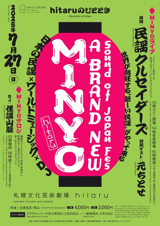 多くの人が耳にしたことがあり、口ずさめる“民謡”。いまや世界からも注目される日本の民謡の“新たな魅力”を存分に体感できる音楽フェス「Sound of Japan Fes」を開催!ブルーノート東京との共同プロデュースによるライブ公演「MINYOライブ」と、劇場ホワイエにてライブ公演の前後・休憩中に民謡のDJ・道内グルメなどが楽しめるスペシャルビュッフェ「MINYOサロン」の二本立てでお届けします。