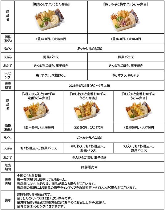 また、お客さまの声にお応えして「丸亀うどん弁当」に初のサイズ展開となる“大”サイズが登場。うどん1.5玉が入り、満足感のある一杯をお楽しみいただけます。この春は、手に取りやすい430円の商品も加わり、味わいは全5種のラインアップをご用意しています。爽やかな春風が心地よく、外での食事がより楽しくなる季節。ゴールデンウィークのおでかけやピクニックはもちろん、さまざまなシーンでお気軽にお楽しみください。