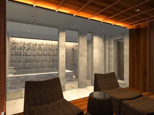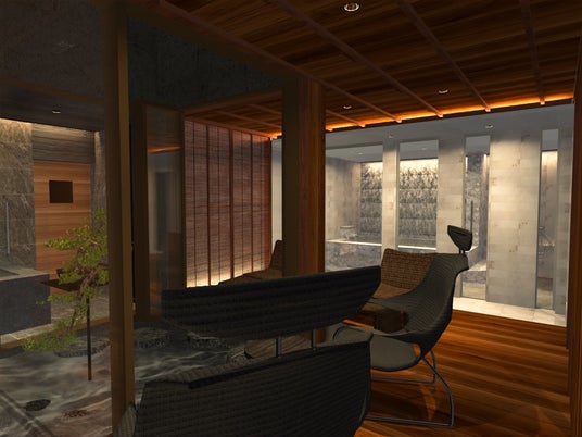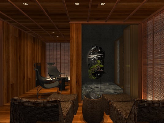 1階フロアはすべてをSPAエリアとして贅沢に設え、ゆったりとした湯船に加え、サウナ、水風呂、ヒーリングスペースを備えた癒しの空間を構成。喧騒を離れ、心と身体を解き放つ至福のひとときをお過ごしいただけます。ヒーリングスペースでは、夏の情景を想起させる葦戸や、光の反射を巧みに取り入れた坪庭アート、素材の切り替えによる繊細なコントラストを配することで、静謐で幻想的な雰囲気を演出。五感を通じて心身を解きほぐす、非日常のひとときへと誘います。