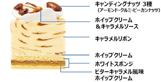 とろ~りキャラメルとバニラがマッチした「キャラメルリボン」には、専用に開発したキャラメルケーキを合わせました。さらにキャンディコーティングした3種のナッツをトッピングし食感や味わいに深みを加えています。