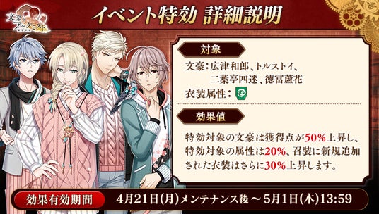 さらに、イベントと同時に開催される限定召装『余花を愛でる者』にて新規追加された「広津和郎」「トルストイ」「二葉亭四迷」の〈桜洋服〉を編成すると、得点の獲得率がそれぞれ30%上昇します。