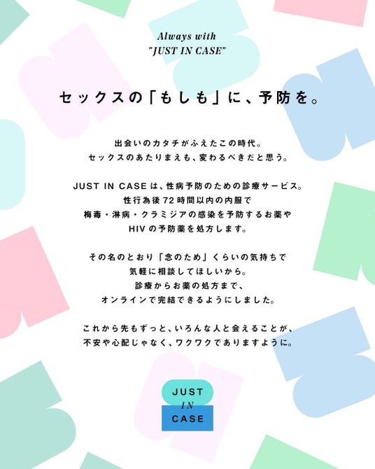 内科疾患・感染症にかからないカラダを実現し、すべての人が当たり前に健やかで豊かな生活を過ごせる社会を目指す、医療法人社団OURSが運営するKARADA内科クリニックは、4月22日(火)より性感染症予防のためのオンライン処方診療サービス「JUST IN CASE」をスタートします。