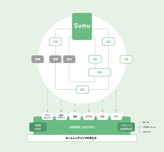 ADDReCがプロデュースするSumuブランドのコンセプトやレギュレーションをベースに、Airbnb Partners参画企業が得意な領域で力を合わせ、複数社でSumuとその周辺領域の活性化に貢献します。